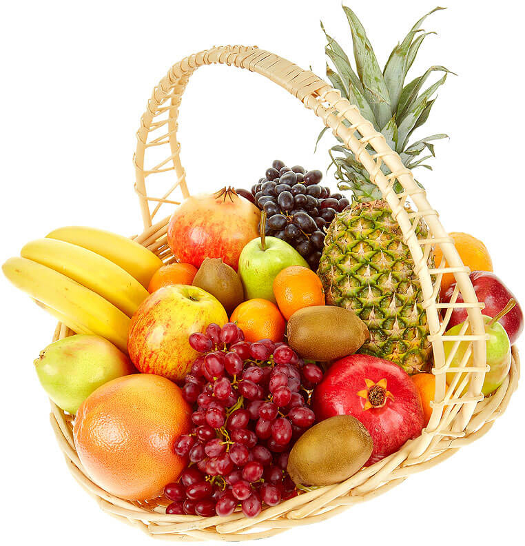 1 ананас, 2 ветки винограда, 5 бананов, 3 граната, 1 грейфрукт, 3 груши, 3 яблока, 5 мандаринов, 5 киви, корзина1 ананас, 4 ветки винограда, 5 бананов, 5 гранатов, 2 грейфрукта, 5 груш, 5 яблок, 5 мандаринов, 5 киви, корзина